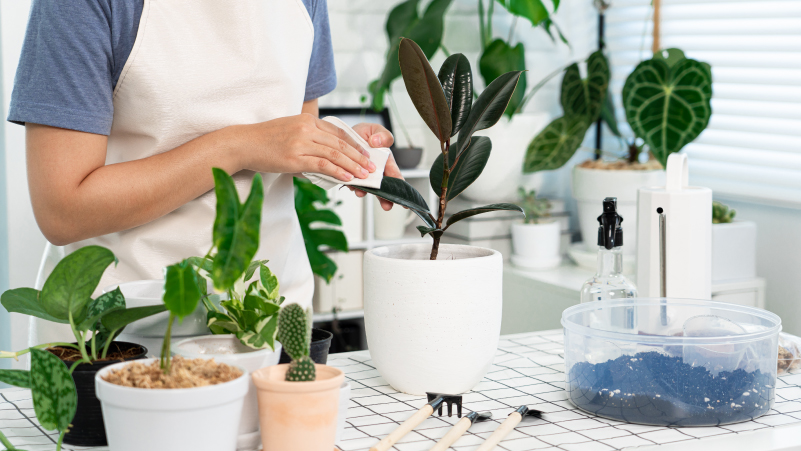 大型の植栽だけではなく、中型や小型の植栽を置きたい際も、事前に内装設計に取り込んだうえで配置を検討すると、後々のトラブルを回避できます。幅広いサイズが置けるよう、テーブルやカウンターなど什器の幅は広めに内装設計しておきましょう。棚段の高さについては高めに調整すると、余裕をもった置き方ができるだけではなく、生の植物が成長した場合も、干渉することなく植栽として役割を果たせます。